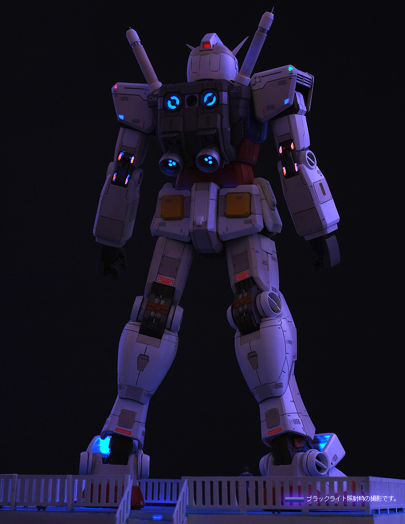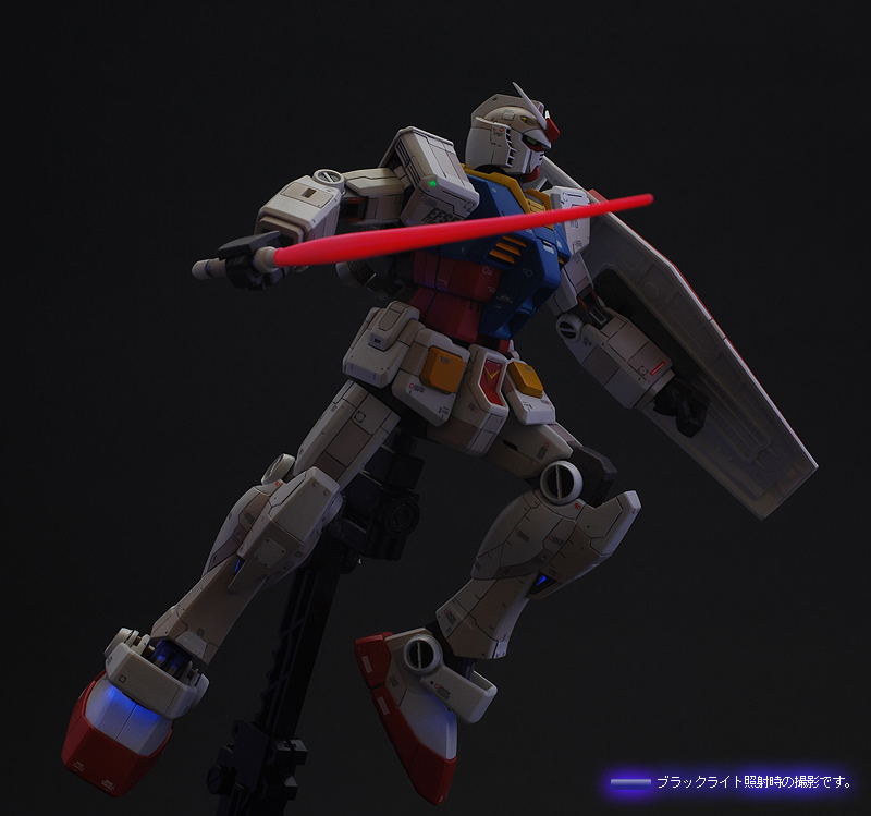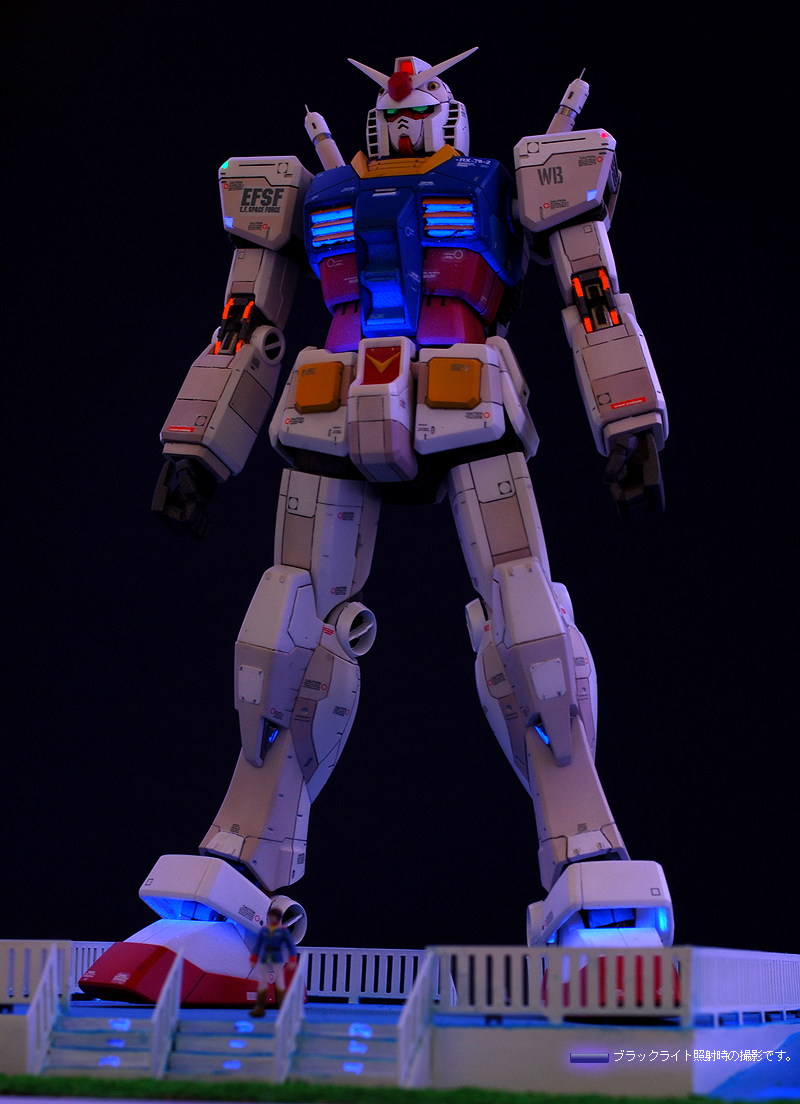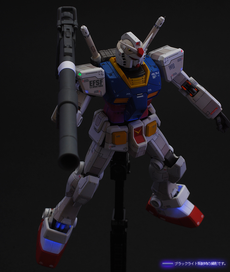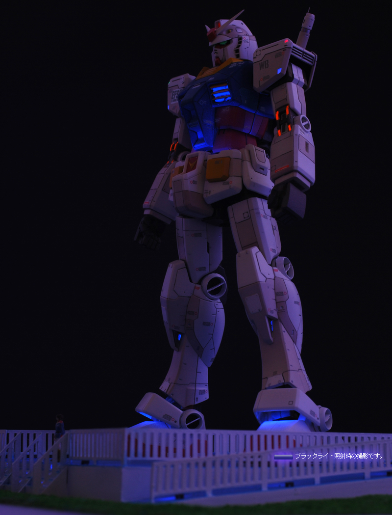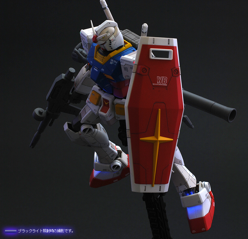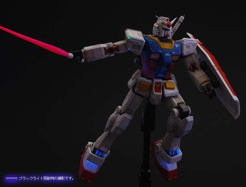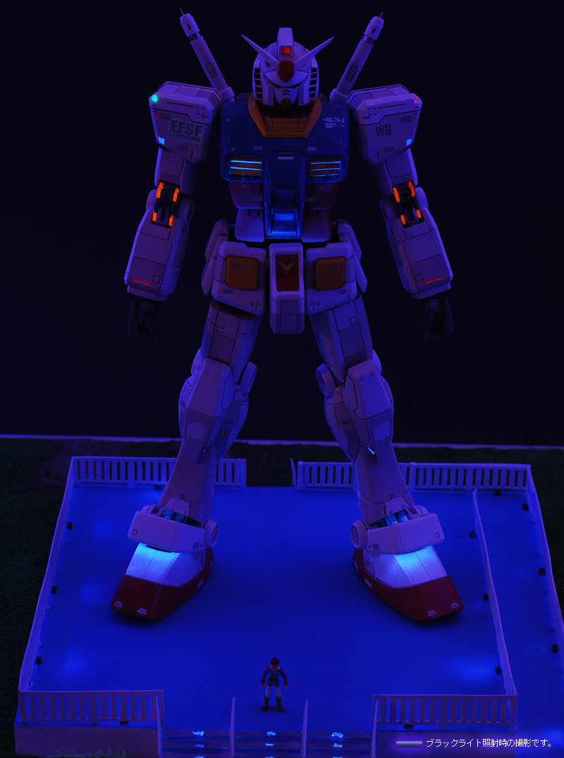 ブラックライトを照射すると各所に塗装された蛍光塗料が反応し、まるでLEDを組込んだかのうような発光をします。 また、お台場ガンダムのように夜間ライトアップの気分を味わうことができます。 これらは部屋の明かりを暗くぜずに明るいままでも発光状態を楽しむことが可能です。
